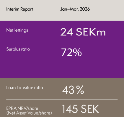 We have a clear strategy for our property portfolio, with a geographical focus on selected districts in high demand in the Stockholm area. Through good market knowledge, efficient property management with our own staff, a high level of service and flexibility and a stable financial position, we are able to create value for our owners and other stakeholders.