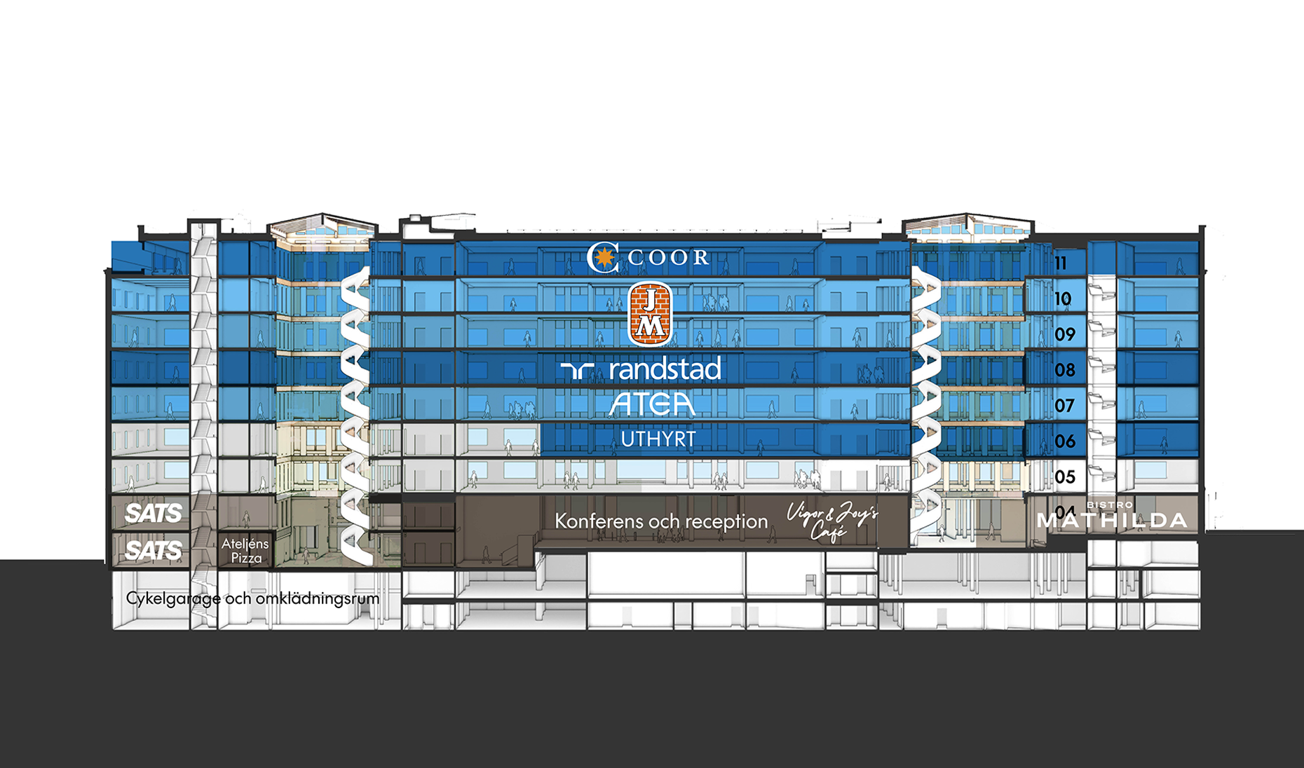 The building offers everything to simplify and enhance everyday life: a café, restaurant, reception, conference facilities, gym, bike garage with changing rooms, and access to a car park. There are also large social spaces for meeting and socialising.