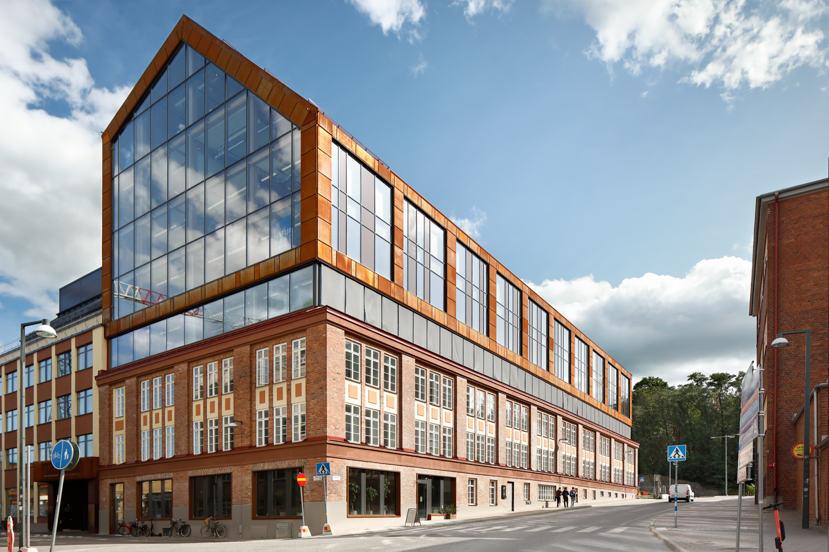 Nyrenoverad industribyggnad med gemensam takterrass, restaurang, cykel- och bilparkering.
