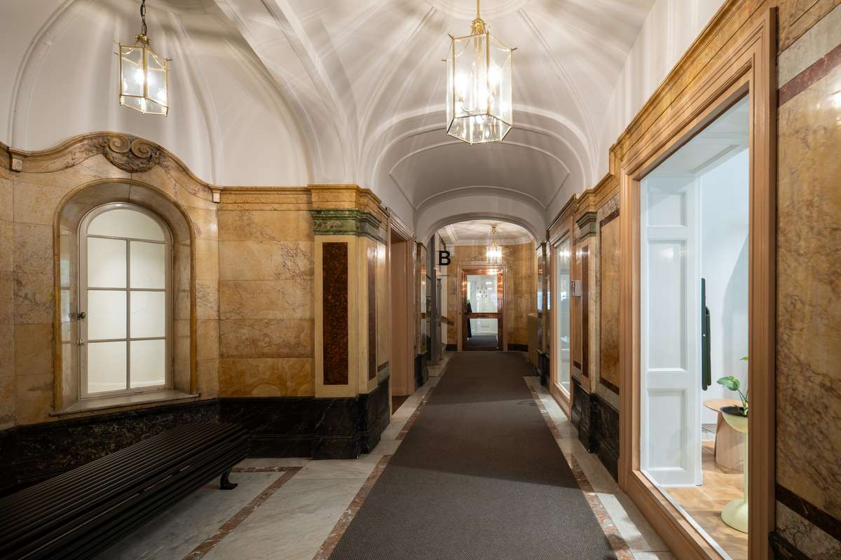 Entrén är utformad i vit marmor med pilastrar och tidstypiska detaljer. Taket har stuckatur med rosetter och i trapphuset är glaset färgat i olika motiv. En av hyresgästerna i huset är Studio B3:s showroom, som funnits i fastigheten i över 60 år.