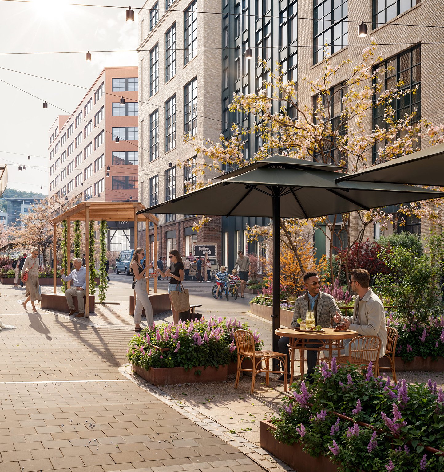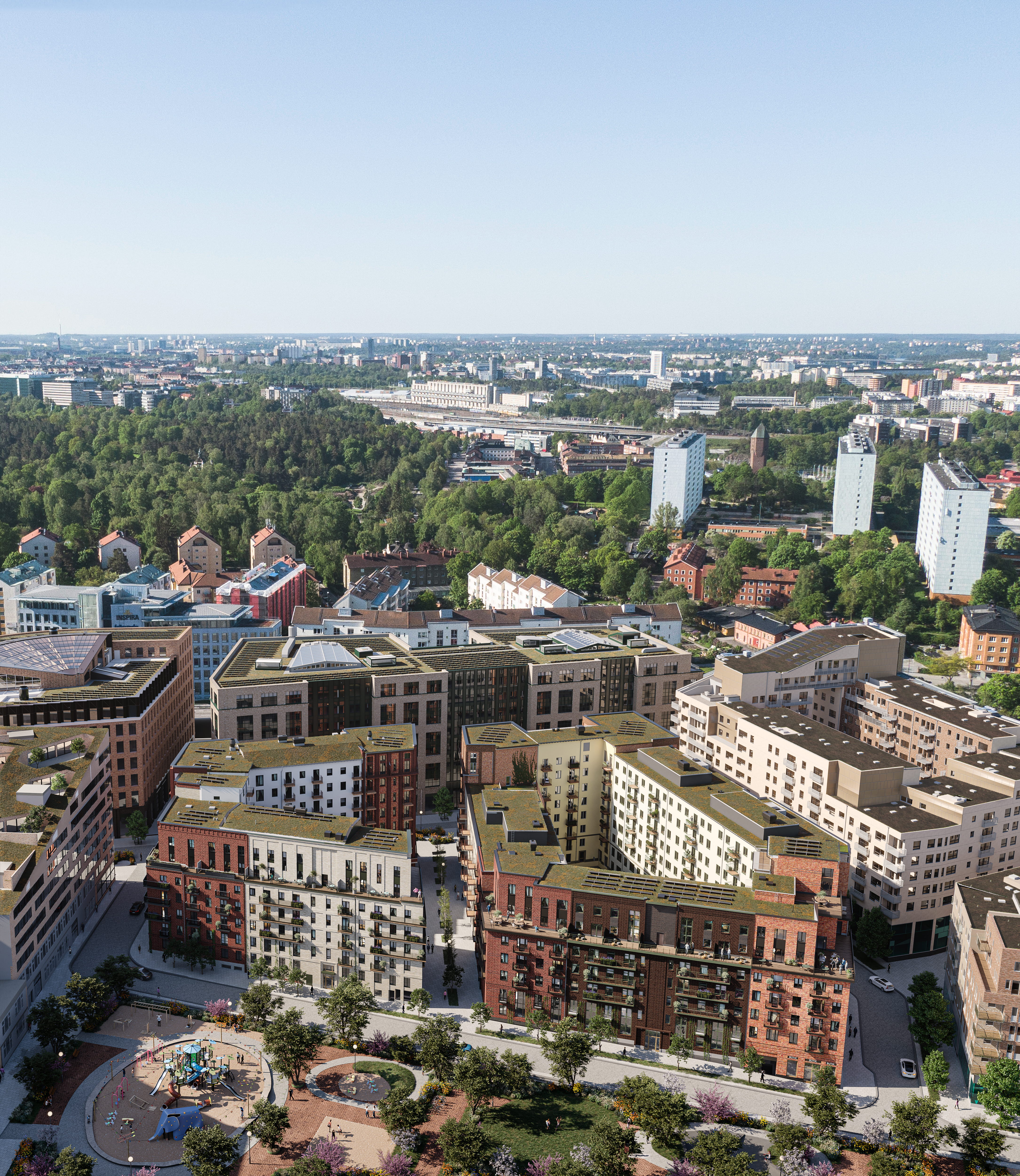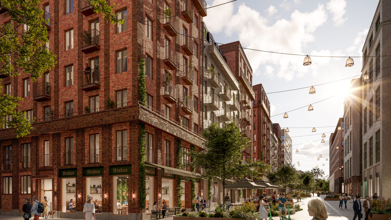 Samtidigt skapas en mer intim stadsmiljö med tydlig kvarterskänsla, levande bottenvåningar och mötesplatser mellan husen.