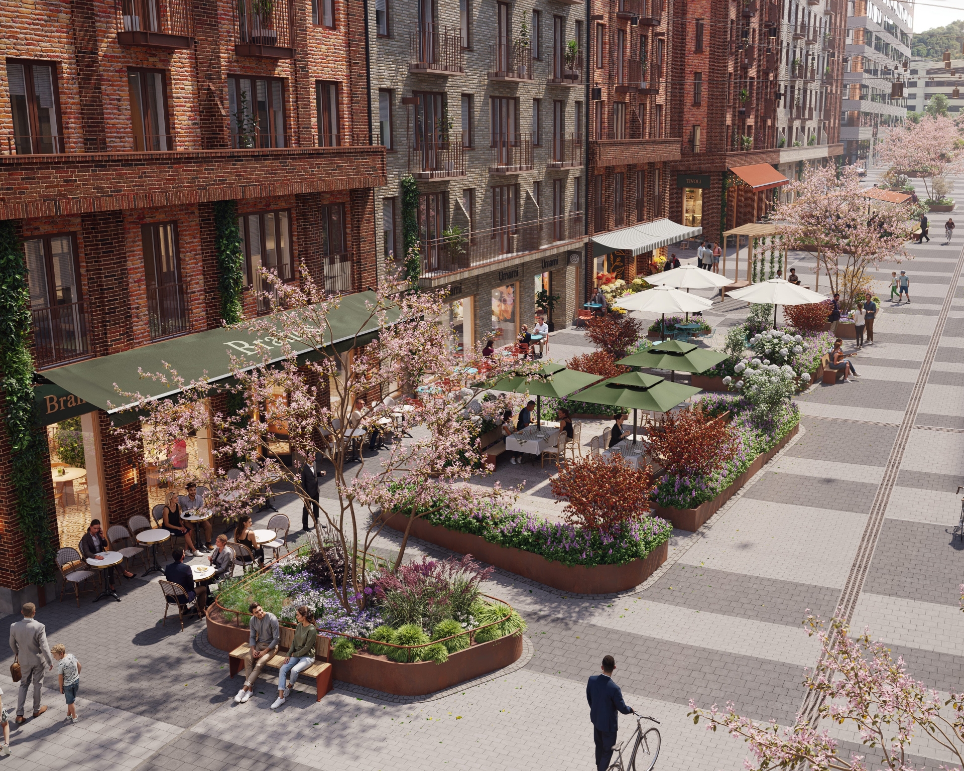 I Haga Norra står människan i centrum för allt vi utvecklar. Det präglar hur vi arbetar med grönska, ljus, avstånd mellan hus, arkitektur, konst och materialval – och vilken typ av butiker och restauranger som får ta plats i området.