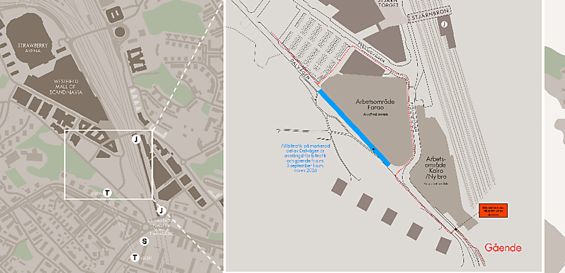 Cyklister hänvisas till att nyttja körbanan på Dalvägen/Pyramidvägen. Se aktuell skyltning på plats.