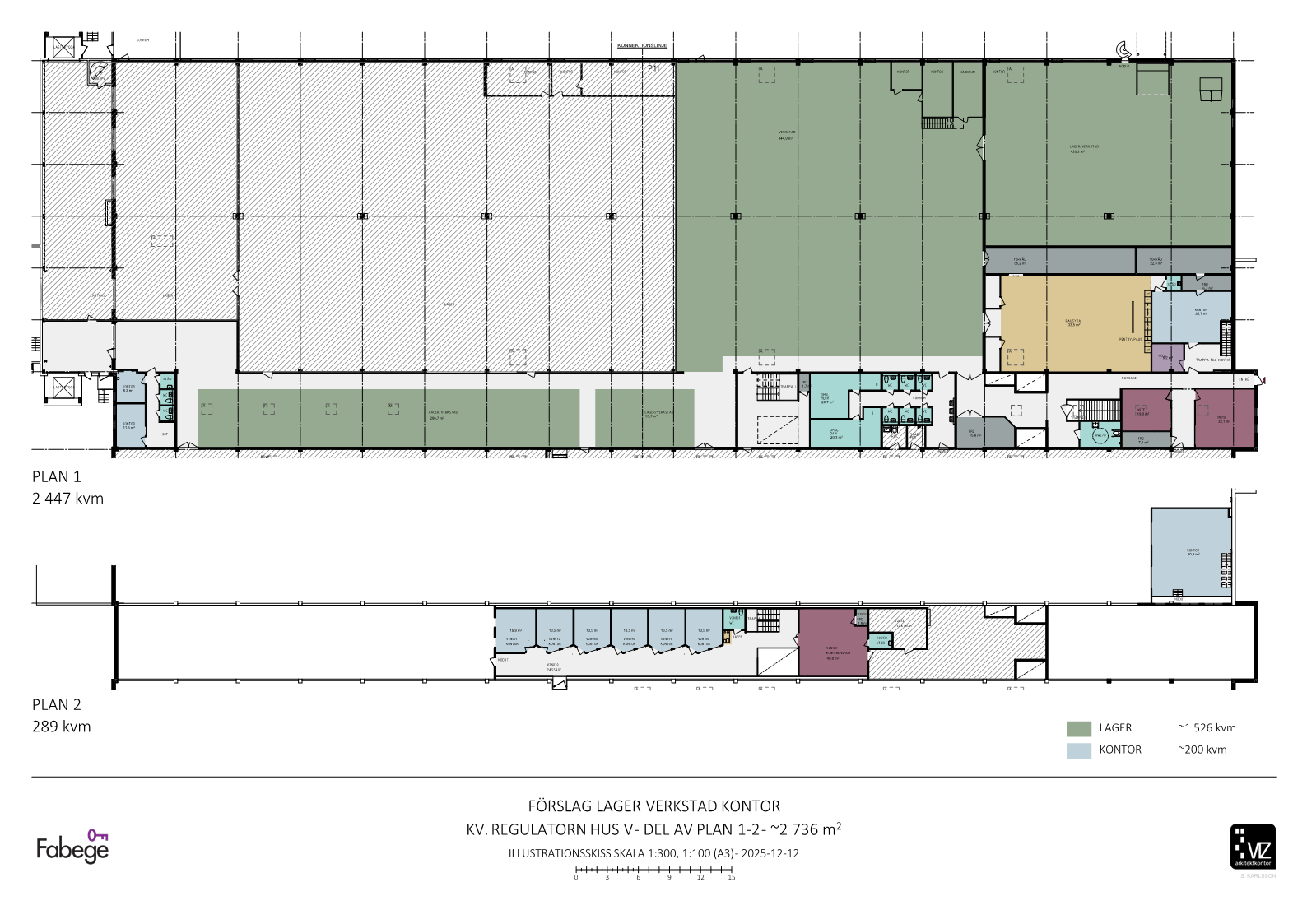 Flexibel och välplanerad lagerlokal om totalt 2 736 kvm med tillhörande kontorsrum och mötesrum. Lokalen som har en egen entré är fördelad på två plan och takhöjden på lagerytorna är på ca 5-6 meter som möjliggör effektiv och smidig lagerhållning. Här får man också en egen lastkaj för effektiv in/urlastning av gods. Det finns en interntrappa som sammanlänkar dom två planen på ett smidigt sätt där plan 2 idag består av kontorsrum och mötesrum. Duschutrymmen och wc grupper är nyligen renoverade och det finns separata omklädningsrum för dam och herr.