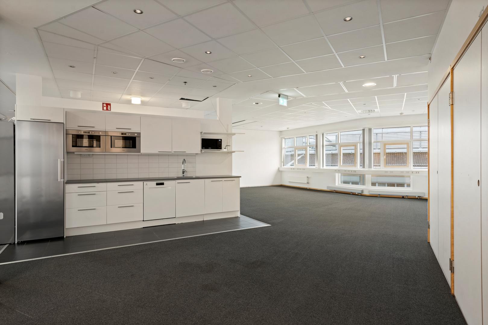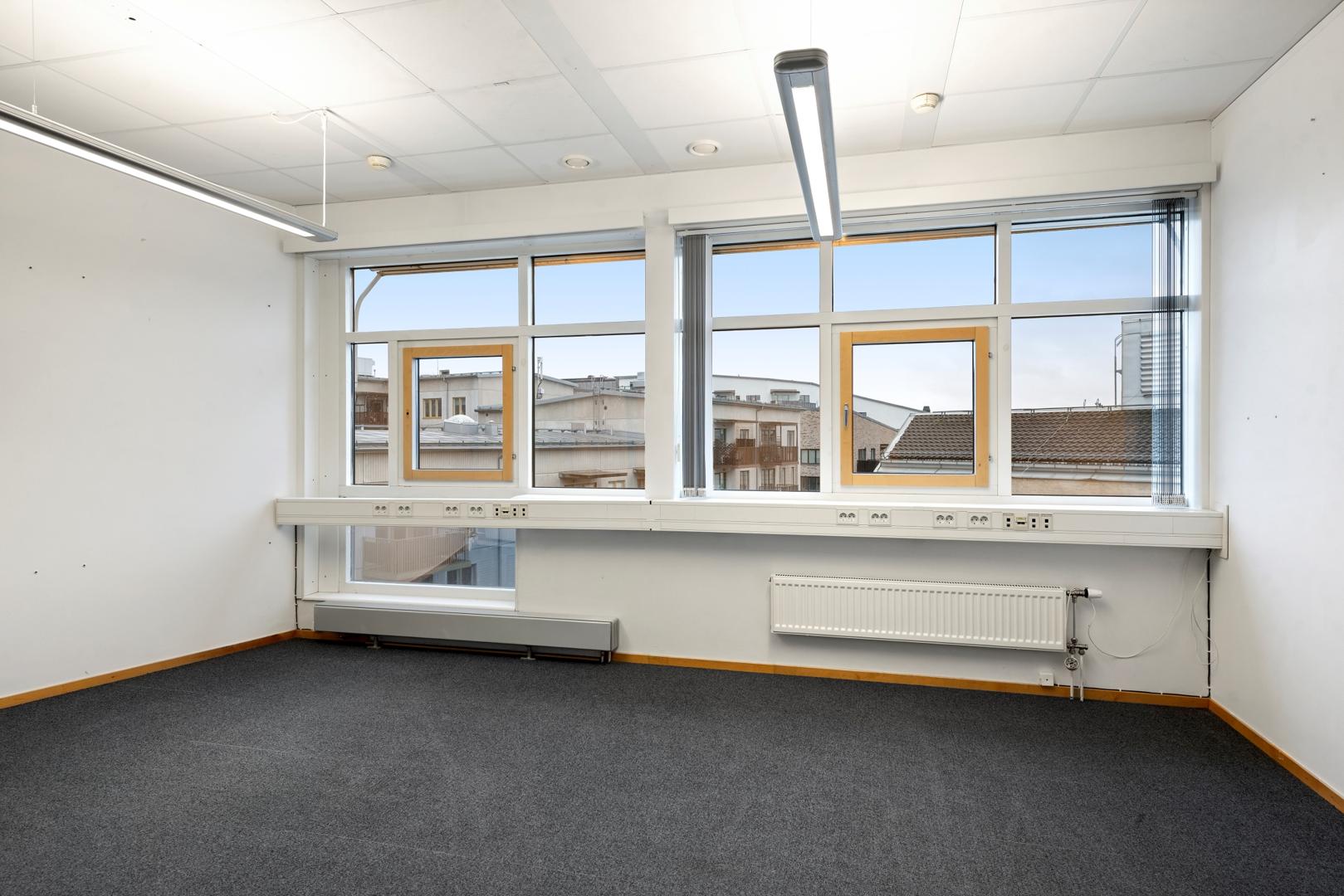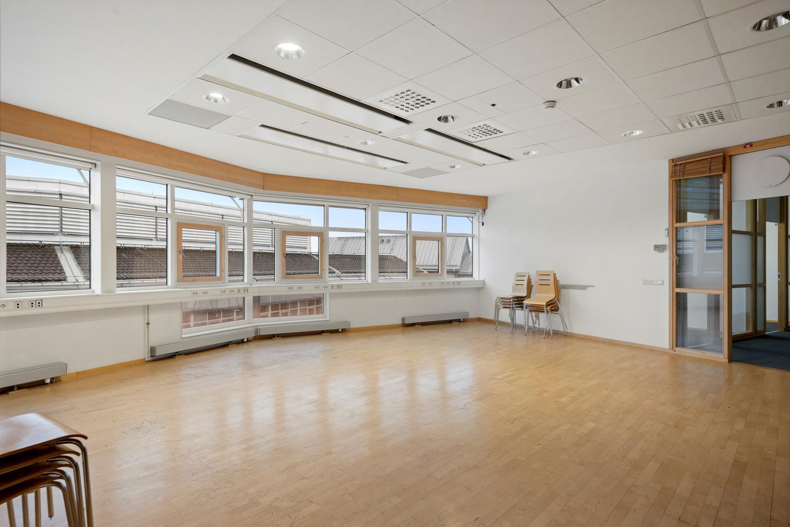 Ljus kontorslokal med generöst dagsljus från stora fönsterpartier och en planlösning med flera kontorsrum, mötesrum och gemensamma ytor som skapar en trivsam arbetsmiljö.