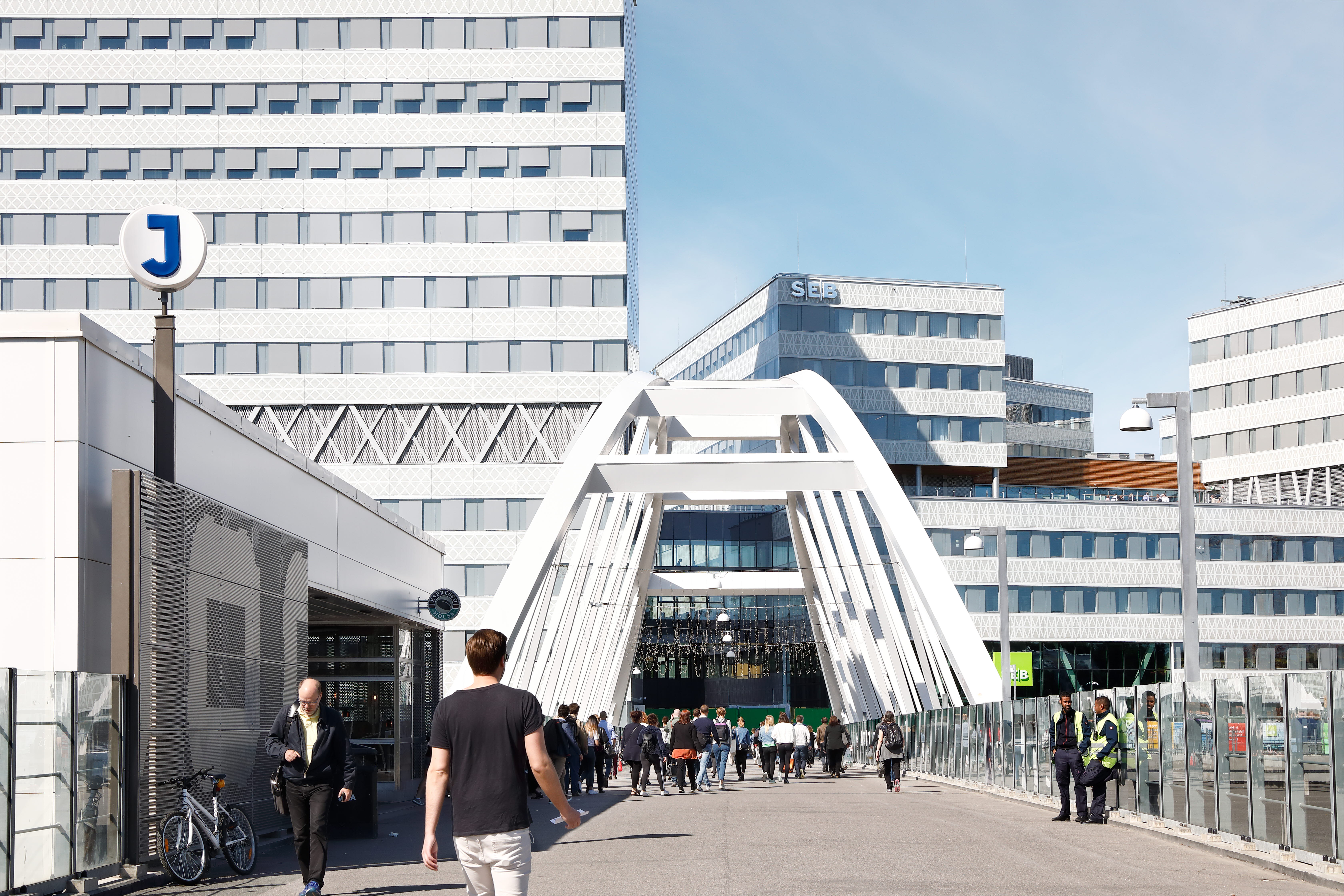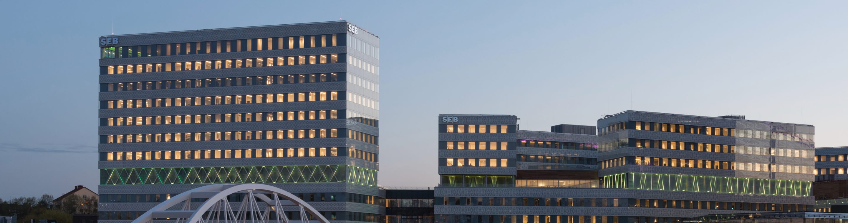 Inuti de prisbelönta lokalerna – som röstades fram till ”Sveriges Snyggaste Kontor” vid flytten 2017 – står mötet i centrum. De tre byggnaderna är sammanlänkade med spänger och ljusgårdar som uppmuntrar till spontana samtal mellan bankens olika avdelningar. Med egna restauranger, caféer, gym och till och med takparker där man kan promenera mellan husen, har SEB skapat ett eget ekosystem.