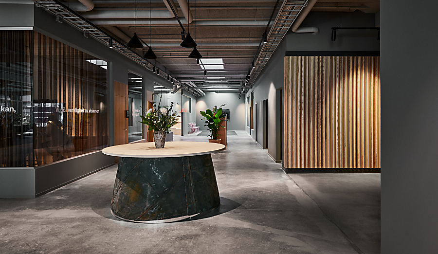 Vårt nya områdeskontor på Englundavägen 5 i Solna Business Park är ett tydligt exempel på hur design och återbruk går hand i hand.