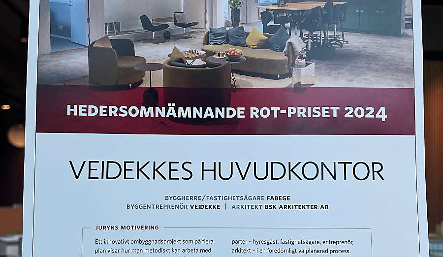 Veidekkes nya huvudkontor i Solna Business Park har utsetts till vinnare av Stockholms Byggmästareförenings ROT-pris 2024.