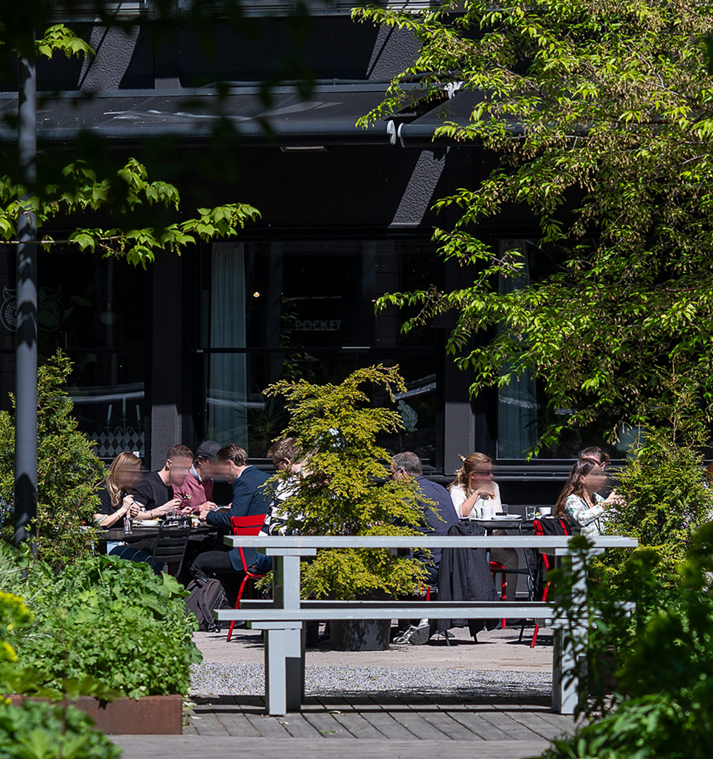 Men många stannar helst i kvarteren. Här finns ett brett utbud av service och mötesplatser: restauranger som Pocket in the Park och Smedens Mathall, padelbana och pickleball, tre gym – däribland ett av Sveriges mest framgångsrika MMA-gym – och löpträning.